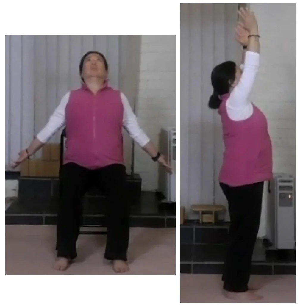 This sequence is the one that I learnt in my teacher training and in a chair yoga class. It might not exactly match what I teach in class—I’m always forgetting which leg I need to step forward or back, I like to take my arms out to the side to raise them instead of taking them up through the centre of the body, I add or change postures—but that’s the beauty of yoga! It’s forever evolving. Play with the postures and discover what sequence of postures feels right for you.