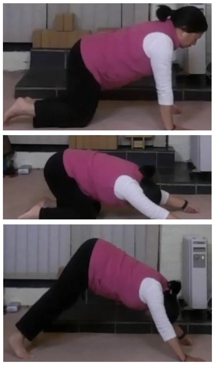 Turn the toes under, raise the buttocks and lower the head between the arms in downward dog.
