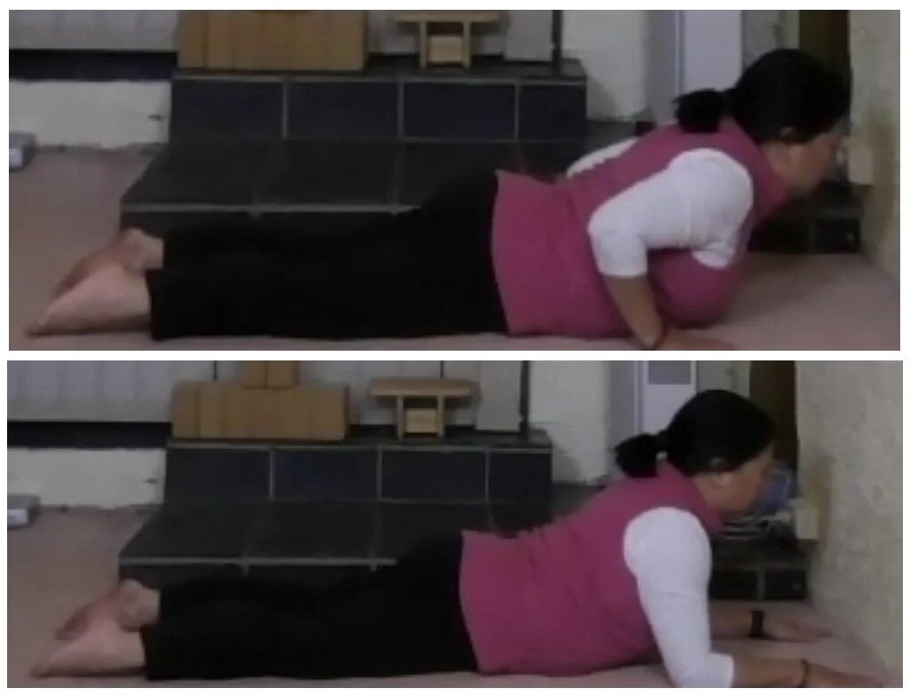 Bring your body weight forward and lower the chest between the hands and the chin to the floor.