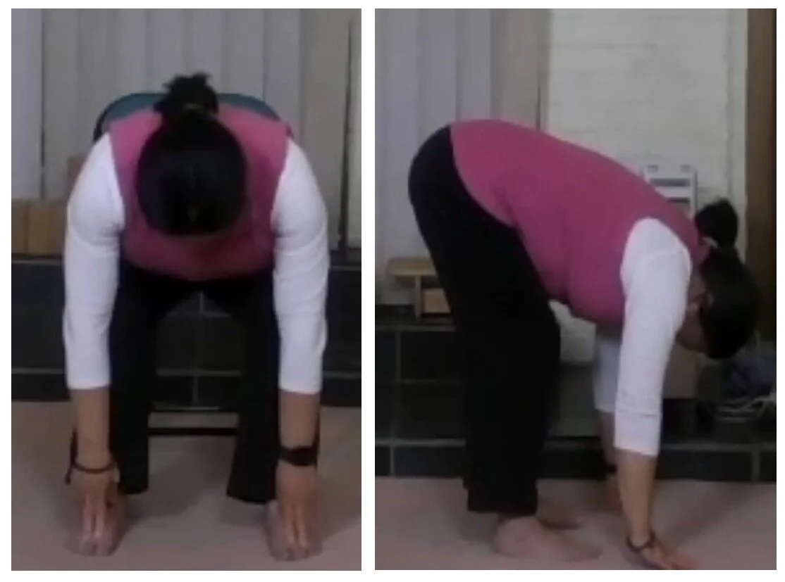 Keep the abdomen close to the thighs, raise the buttocks and lower the head towards the floor.
