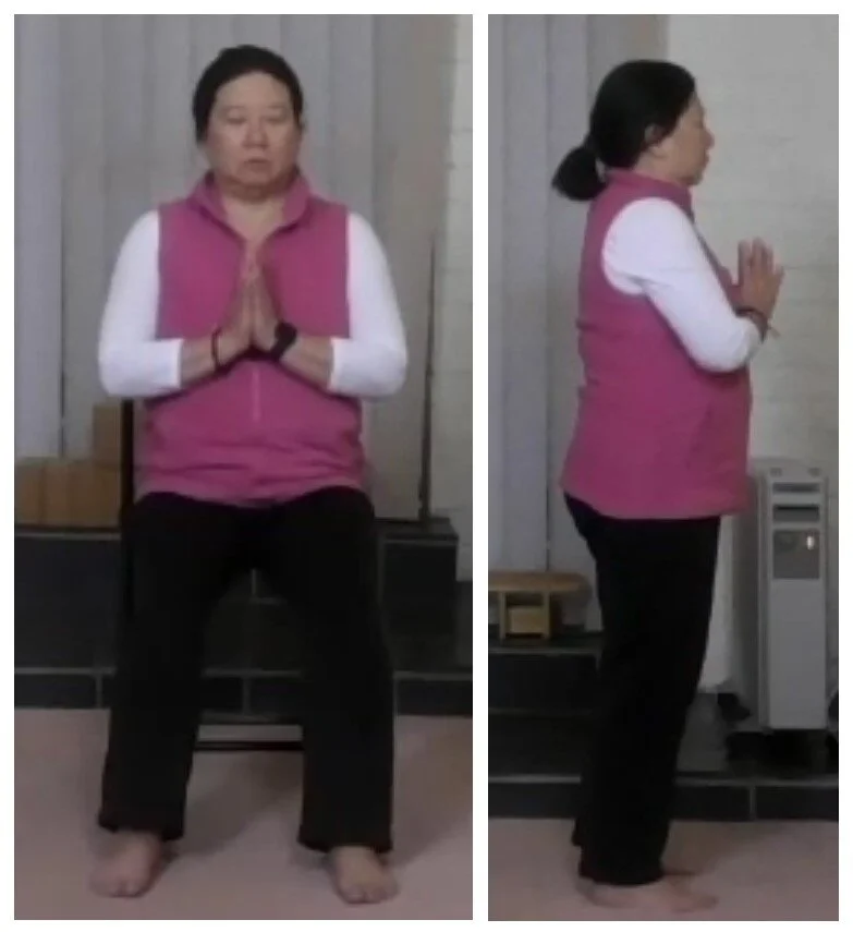 If standing, stand at the front of the mat or in front of the chair with the hands by the side.